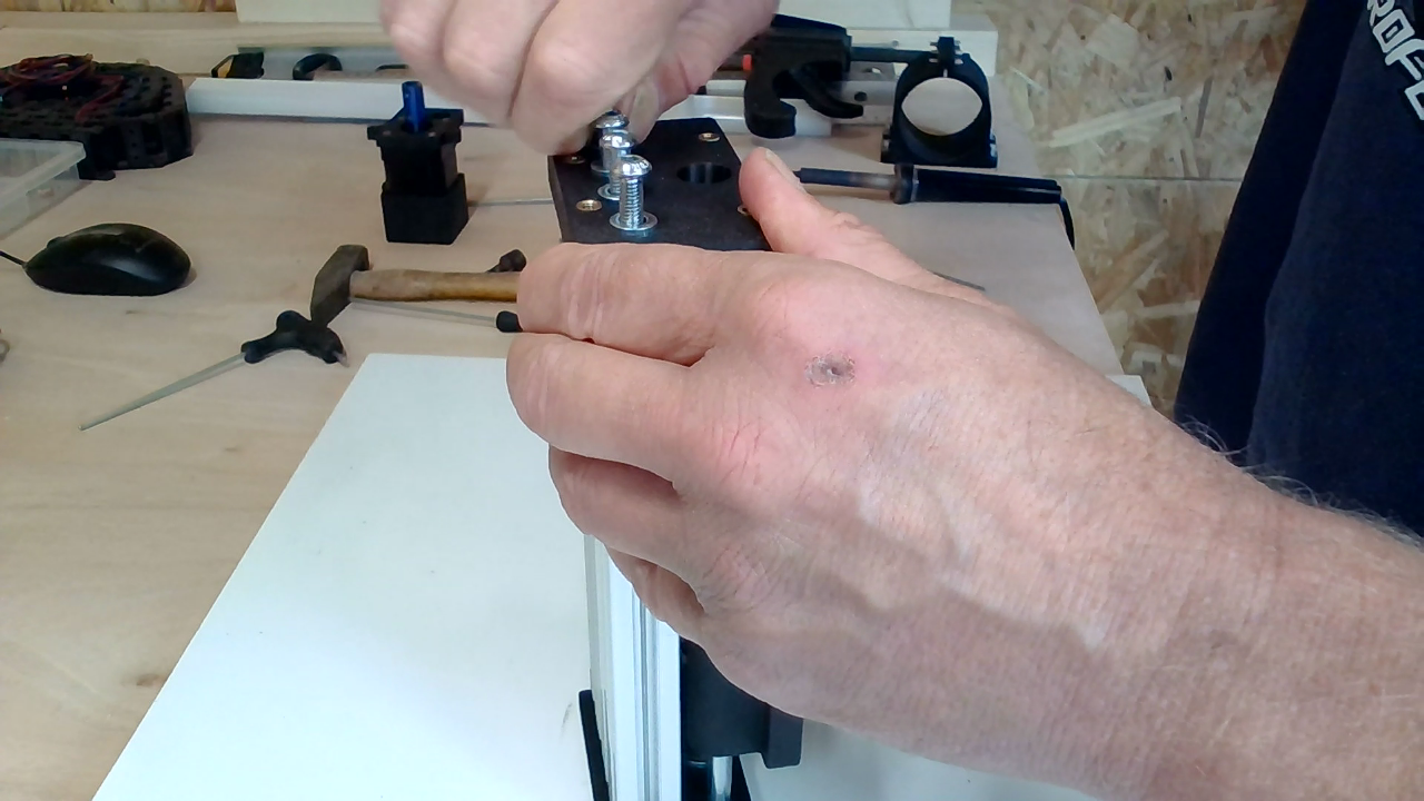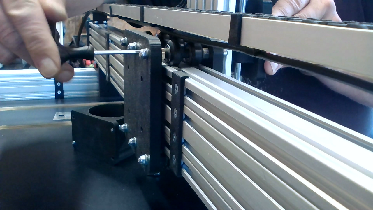 Plaats 4x M4x16 met sluitringen en glijmoeren op de X-gantry zoals op bovenstaande foto.