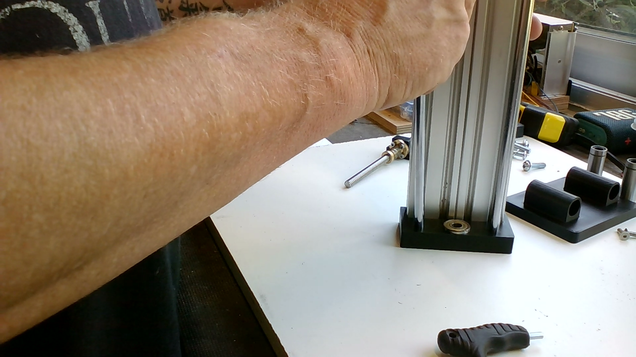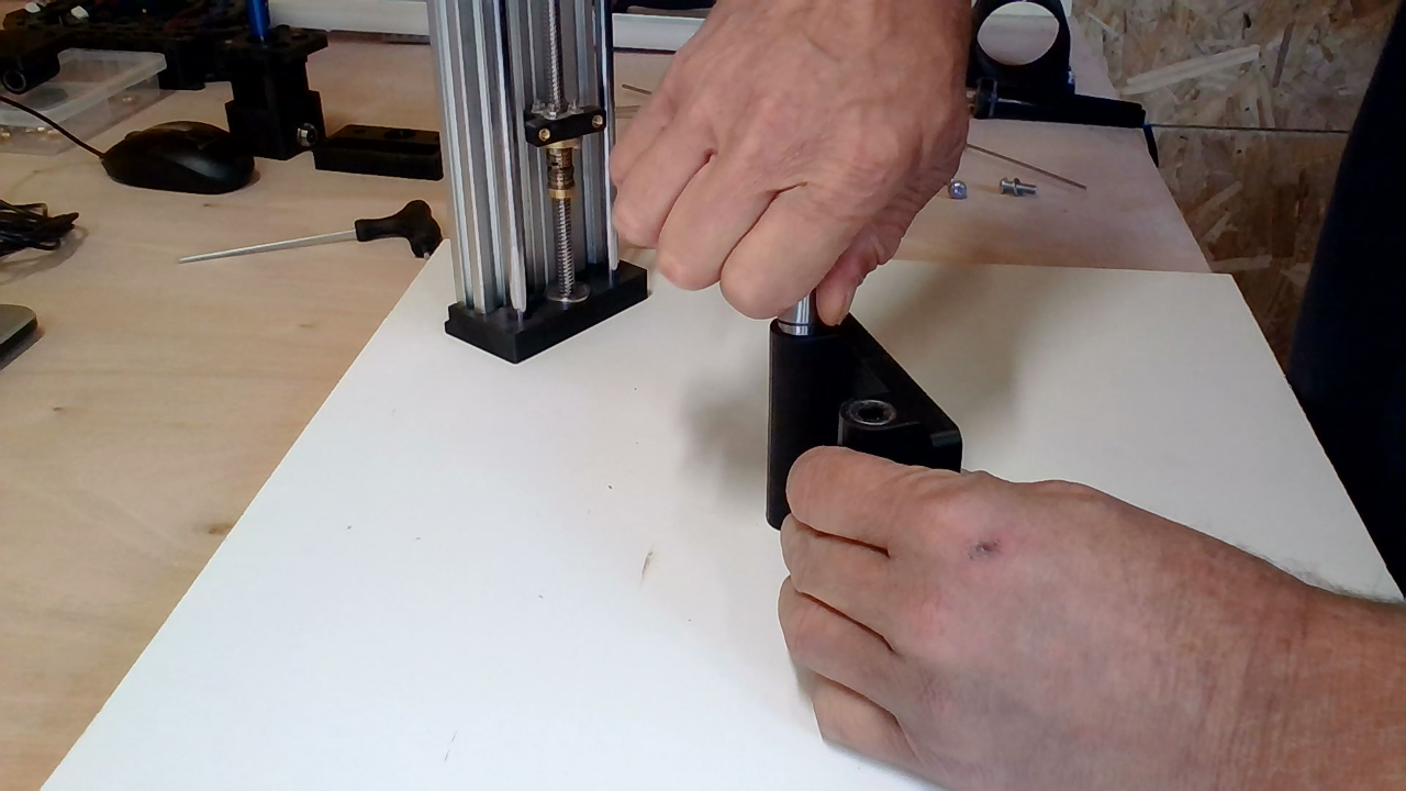 Plaats de leadscrew met moer, veer en de leadscrew-mount in de 608ZZ lager en druk de vier lineare lagers in de Z-gantry. Druk de lagers een paar millimeter verder in de Z-gantry voor een betere geleiding.