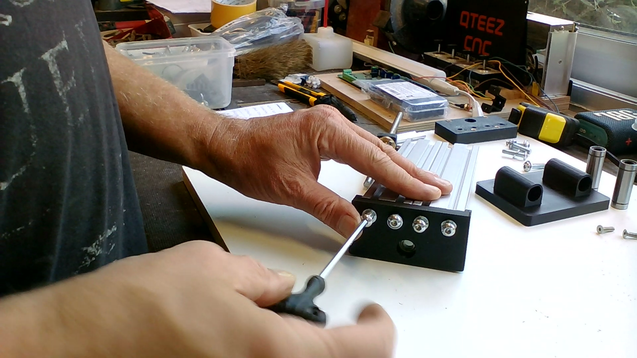 Plaats 4x M4x16 met sluitringen en glijmoeren op de X-gantry zoals op bovenstaande foto.